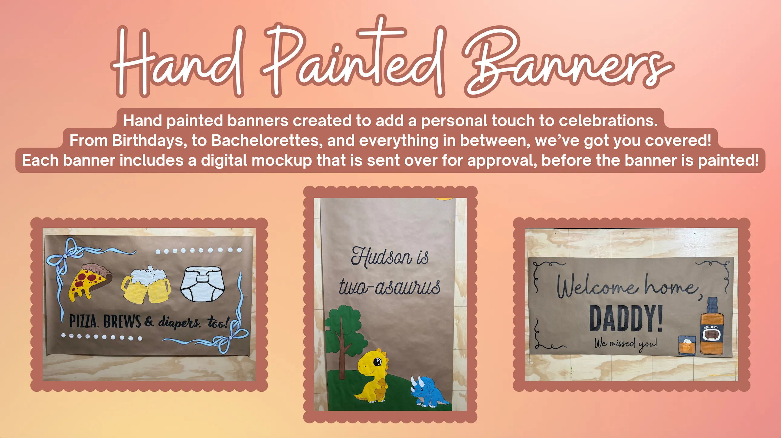 From “Happy Birthday, Mom” to “Congrats on Finally Flying Free,” our hand-painted banners are made to honor all of life’s moments—big, bold, and beautiful!
